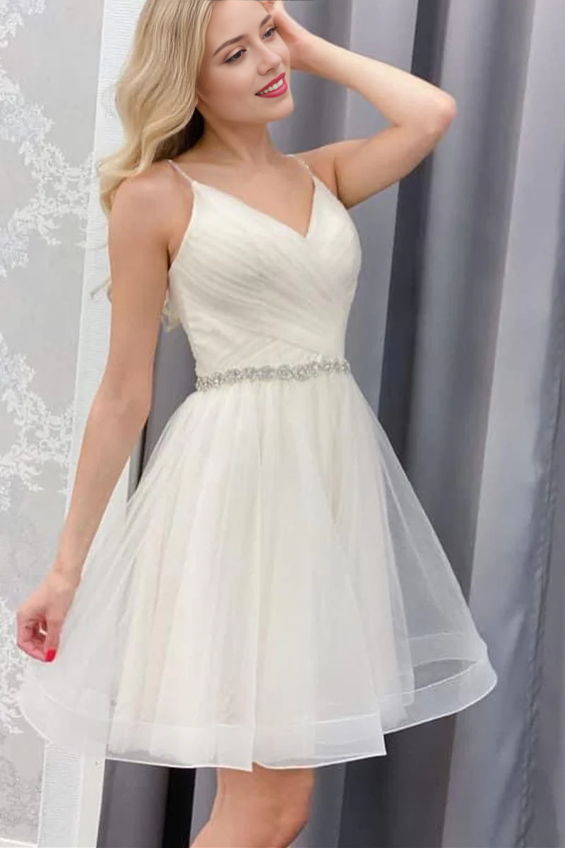 Princess A-line tulle short party dress with v neck, pleated bodice and lace up back.
