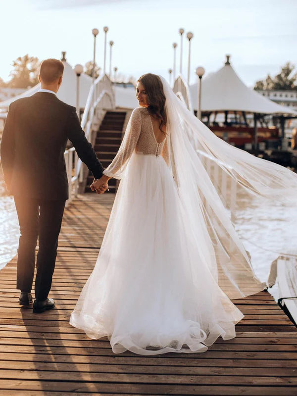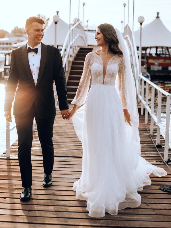 Fascinating Long Sleeves Deep V-neck Lace Backless A-line Wedding Dresses