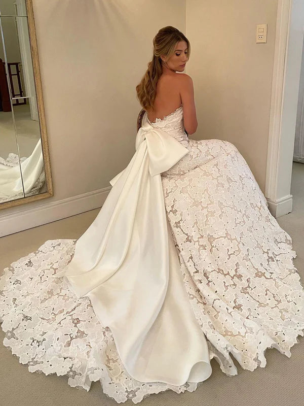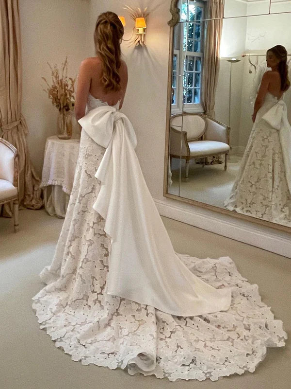 Floral Lace Strapless A Line Wedding Dress with Satin Bowtie Boho Wedding Gown