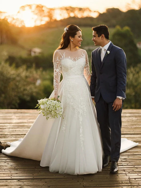 Illusion Rustic Lace Long Sleeves Tulle Wedding Dress With Detachable Satin Wedding Gown